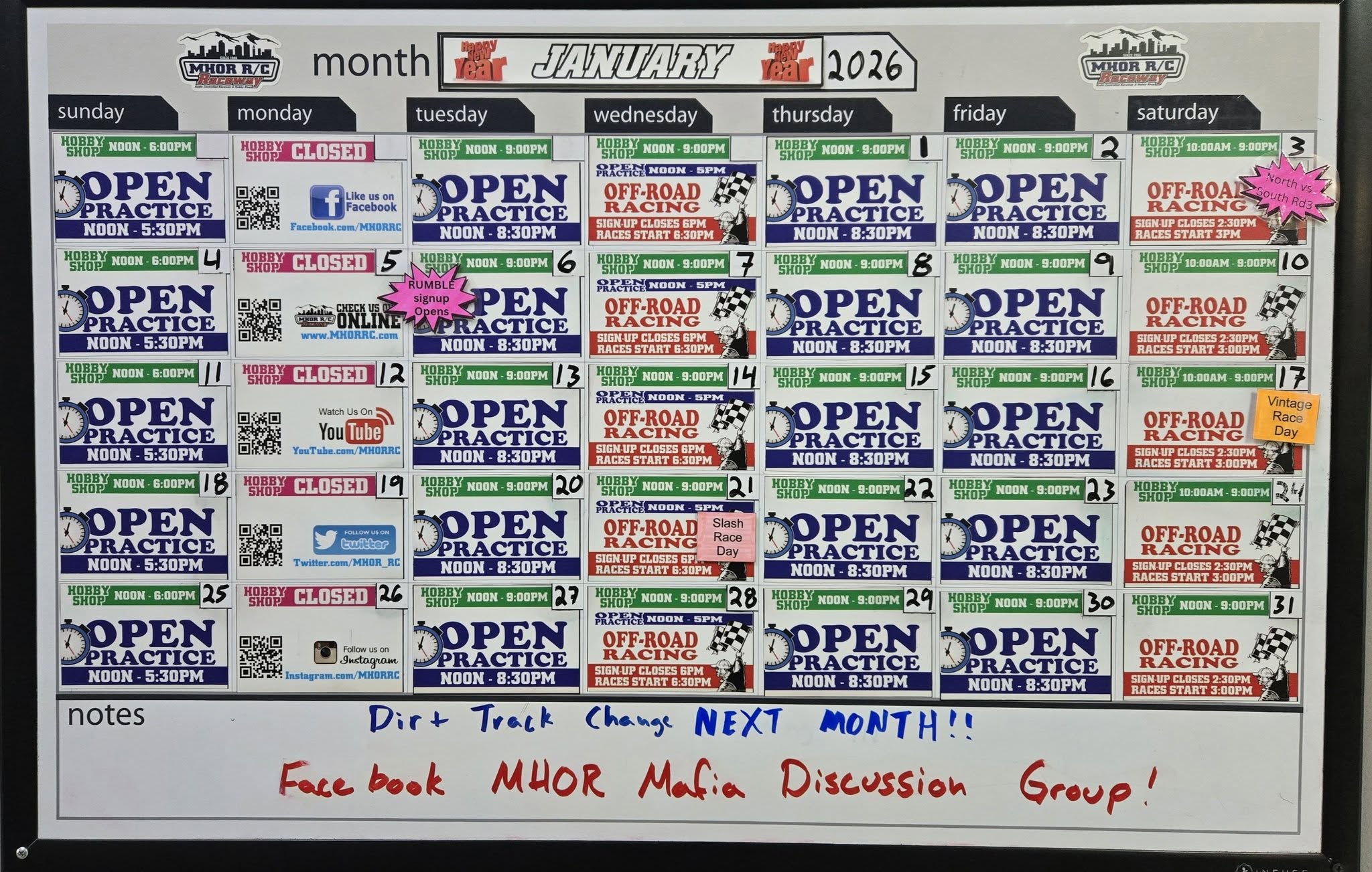 MHOR R/C Raceway is the premier spot for RC Off-Road Racing in the Denver Metro area. Our facility features a full service hobby shop staffed by experienced and knowledgeable racers, stocked with many of the currently popular recreational and race ready off-road buggies and trucks. MHOR R/C features a 3 tracks all for 1/10th scale and smaller vehicles. We have a 7,000 sq. ft. indoor racing facility with 3,000 sq. ft. of blue grooved high traction dirt surface, a 7,800 sq. ft. outdoor Turf off-Road road track, 250+ sq. ft. of rock crawler fun, and enough pit spaces for 90 racers. AC & DC Power available, and we use the latest MyLaps timing system run by the newest Livetime RC Scoring Software. Come by and check us out.
